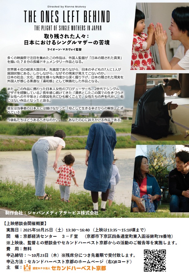『取り残された人々:日本におけるシングルマザーの苦境』は、オーストラリア出身のライオーン・マカヴォイ監督による78分のドキュメンタリー作品です。日本の子どもの約9人に1人が貧困状態にあるという現実と、それを支えるシングルマザーの苦悩を、外国人の視点から「隠された貧困」として描き出した作品です。上演後は監督がご挨拶とQ&A(オンラインの予定)をしていただけるようです。その他、懇談会を行いますので関心をお持ちの多くの皆さまにご参加頂ければ幸いです。