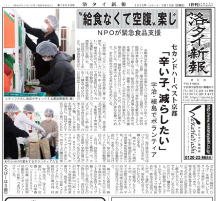 メディア · 2020/03/16 緊急フードバンクこども支援プロジェクト 掲載 京都府南部の地域新聞、洛タイ新報さんに緊急フードバンクこども支援プロジェクトを15日付け紙面で取り上げて頂きました。 tagPlaceholderカテゴリ: