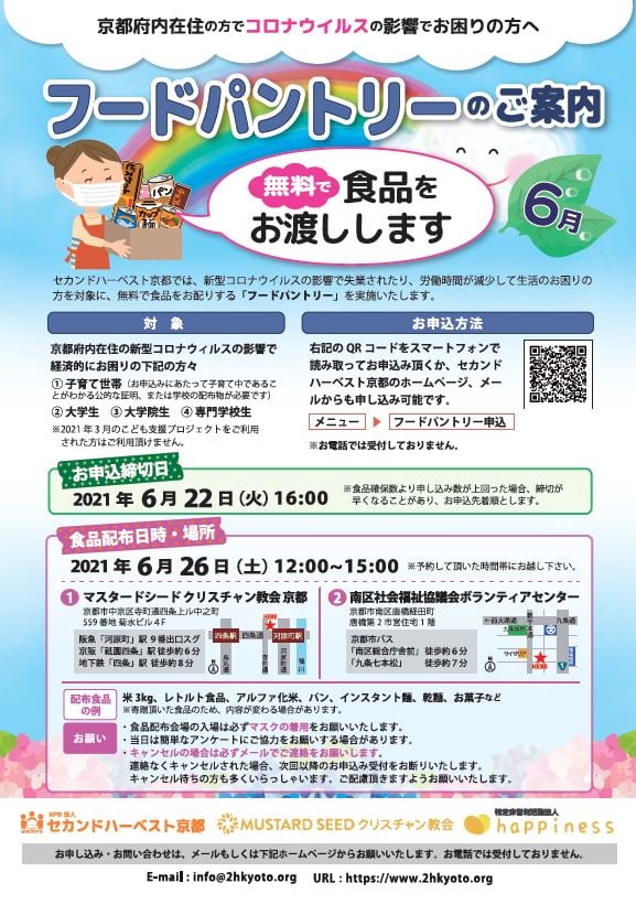 フードパントリー · 2021/06/08 第5回フードパントリー申込受付開始 第5回フードパントリー申込受付開始しました。 対象:子育て世帯世帯、大学生、大学院生、専門学校生 食品分配日:6月26日(土)12:00~15:00 会場1:マスタードシードクリスチャン教会 京都 会場2:南区社会福祉協議会ボランティアセンター 申込締切:6月22日(火)※締切日に関わらず先着順に申込予定数に達し次第締切ます。 申込ページ:フードパントリー申込 ※WEB以外の方法では受付できません tagPlaceholderカテゴリ: