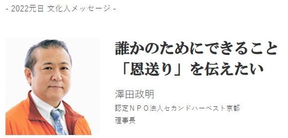 メディア · 2022/02/17 京都新聞元日号「日本人の忘れもの知恵会議」寄稿 京都新聞元日号に理事長澤田が寄稿させて頂いた内容が 専用ページ「日本人の忘れもの知恵会議」で掲載されております。 新たな暮らしの実へ 2022元日文化人メッセージ https://pr.kyoto-np.jp/campaign/nwc_wise/message/culture.html tagPlaceholderカテゴリ: