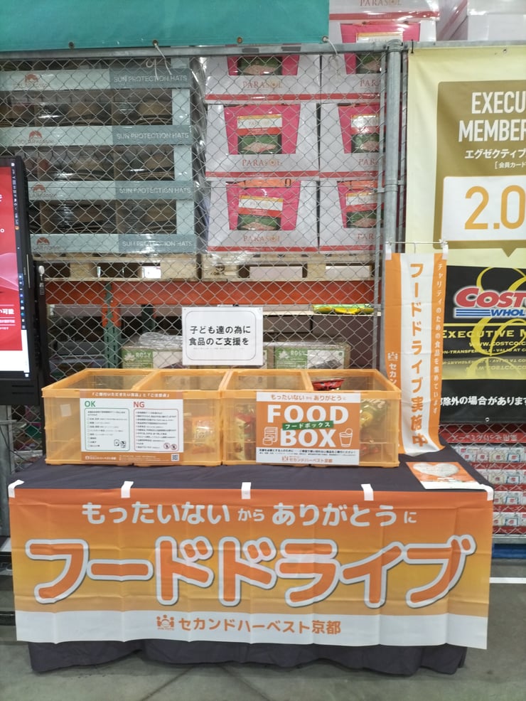 毎回温かいご支援を賜っておりますコストコホールセールジャパン京都八幡倉庫店様ではこの度、倉庫店内にてフードドライブに取組んで頂けることになりました。早速、メンバーシップカウンター前の出口付近にフードボックスを設置頂いております。期間は7月14日(日)までの実施です。